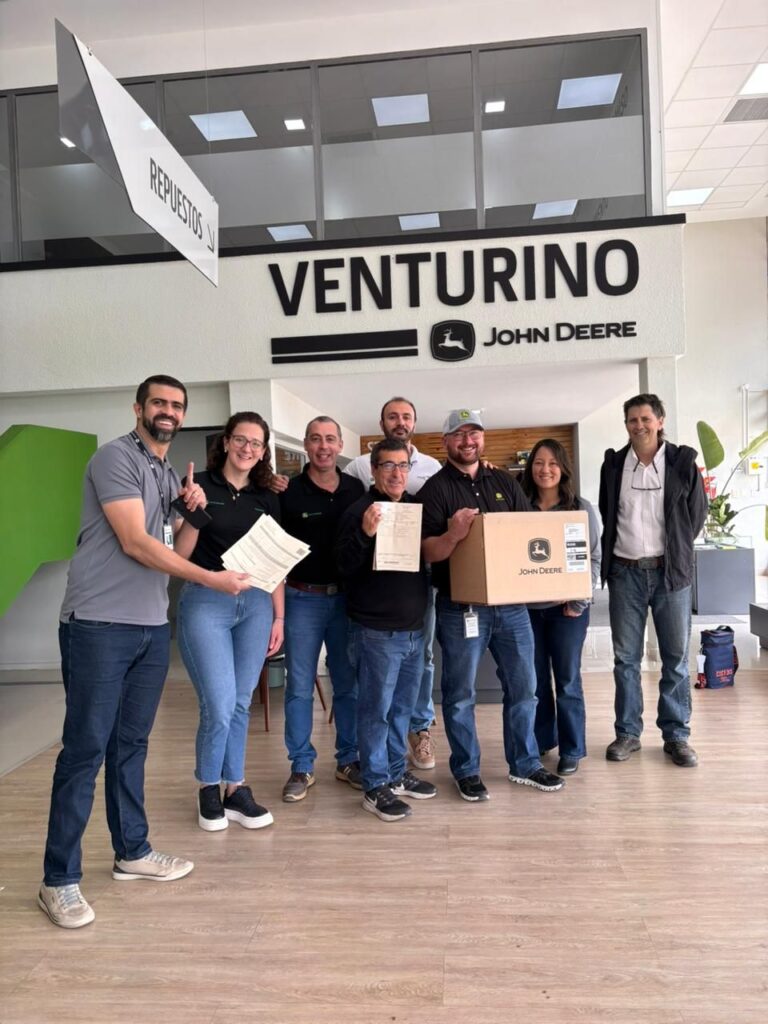 Durante la jornada recibimos la visita de representantes de John Deere Brasil, USA y Argentina —Tharsis Vieira, Brandi Retzl, Ryan Mandle, Martín Negri y Cesar Sansone—, con quienes compartimos el momento histórico del primer pedido despachado a través del nuevo sistema.